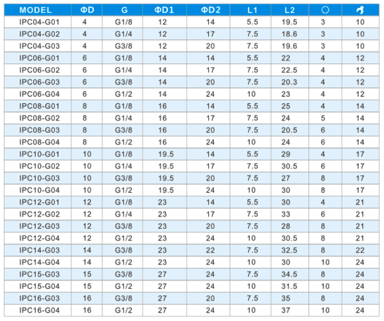 | Dia. | Φ4 | Φ6 | Φ8 | Φ10 | Φ12 | Φ16 | Φ5/32 | Φ3/16 | Φ1/4 | Φ5/16 | Φ3/8 | Φ1/2 |