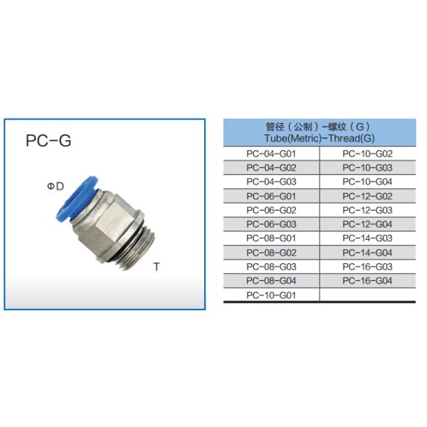 One touch quick push-in fitting straight,elbow,tee,branch tee,plug,splicer,triple,banjo,reduction type,flow regulating type,swivel type,stop type,check type,bulkhead type,tube size 4mm~16mm,inch size 5/32”~1/2”,thread 1/8”~1/2” PT,G,NPT,Metric thread,brass nickle plated body material e.g PC8-G02